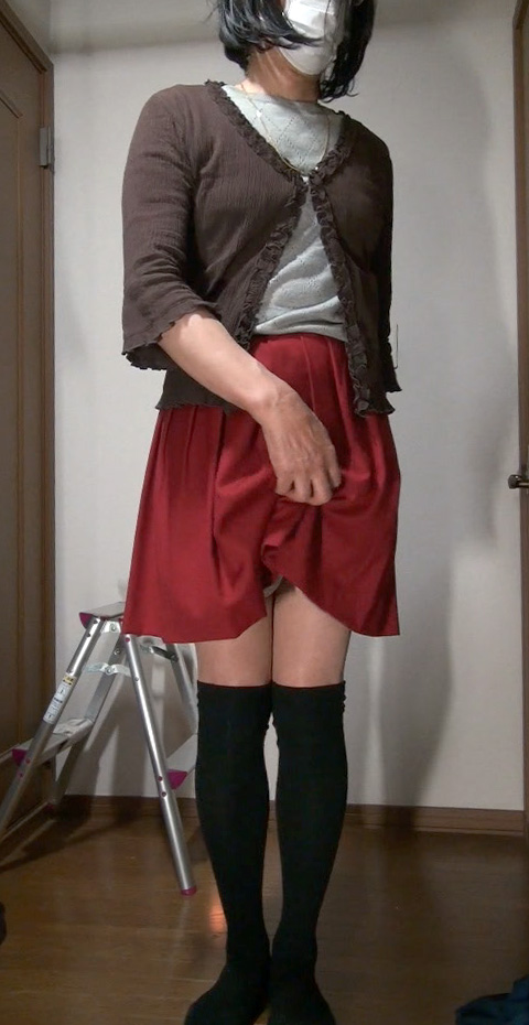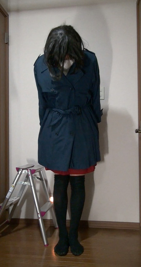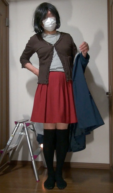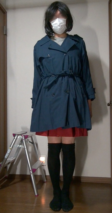 夜間の外出から戻った純子です。この赤いフレアーミニスカートに紺色のトレンチコートを着て出かけました。