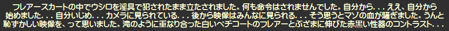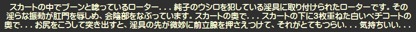 ウシロの淫具のスイッチが入っているから、屈辱的な振動が肛門や会陰部に伝わってきて...それもスカートで隠されているから純子にしか分からない...