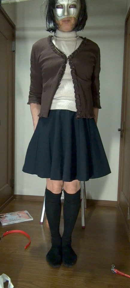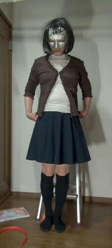 紺色フレアースカートの中にはガーターベルトで吊ったストッキング、赤いロープの股縄、懲罰バンド、ウシロを犯している淫具が隠されて...