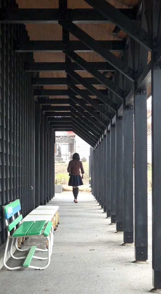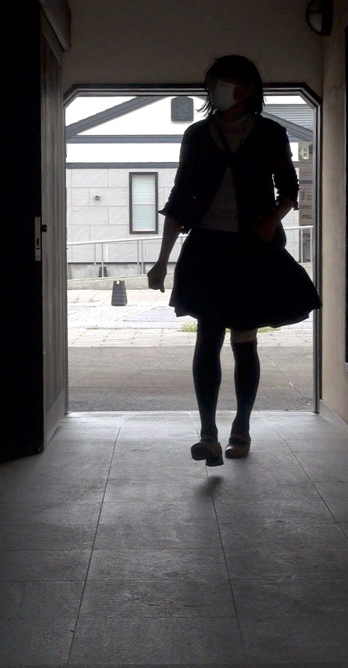ホールの建物を通り抜ける純子です。風も通り抜けていく...向こうに見えるのは一般車道。靴音がコツコツと響きます。