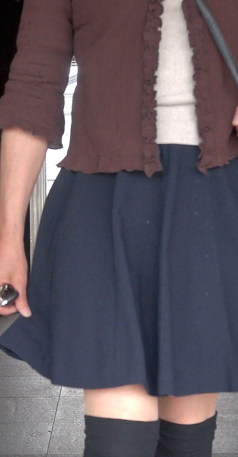 同じ通路を進んだところにカメラを据えてズームアップ...スカートとハイソックスの間の太ももに目が吸い寄せられます...