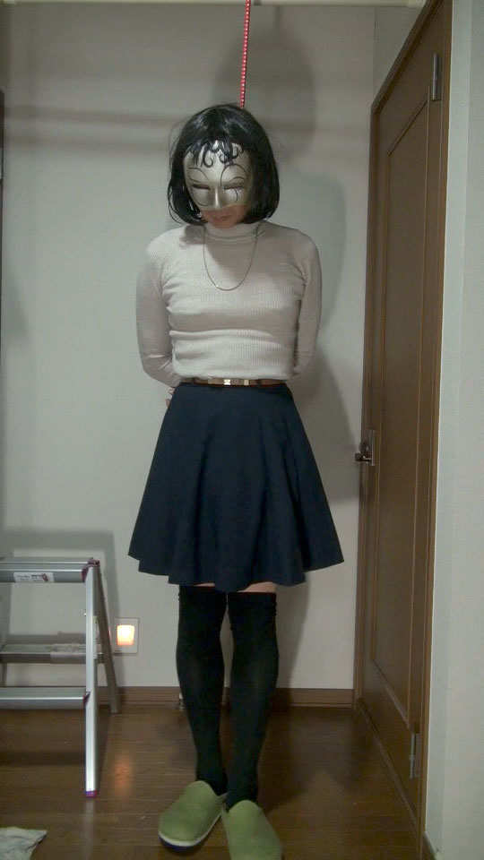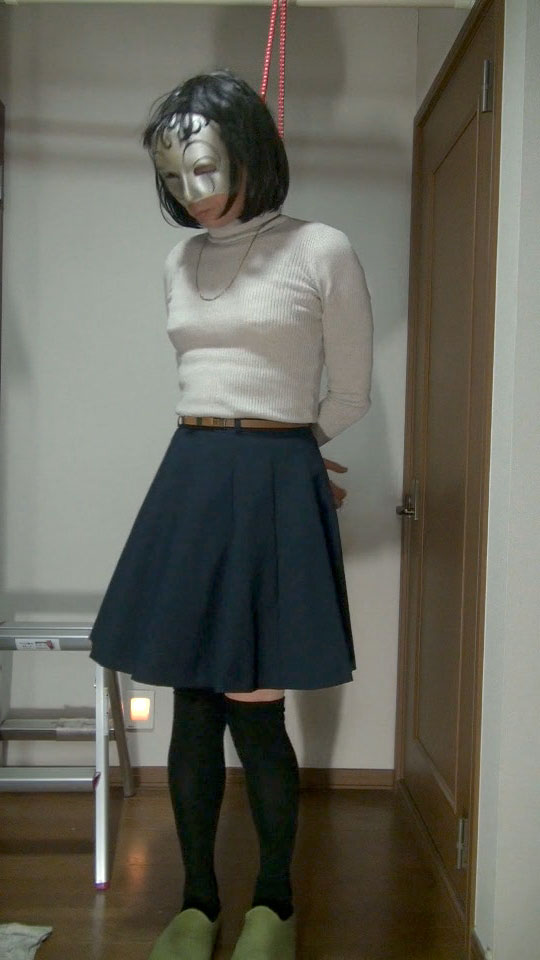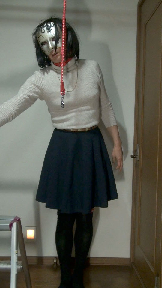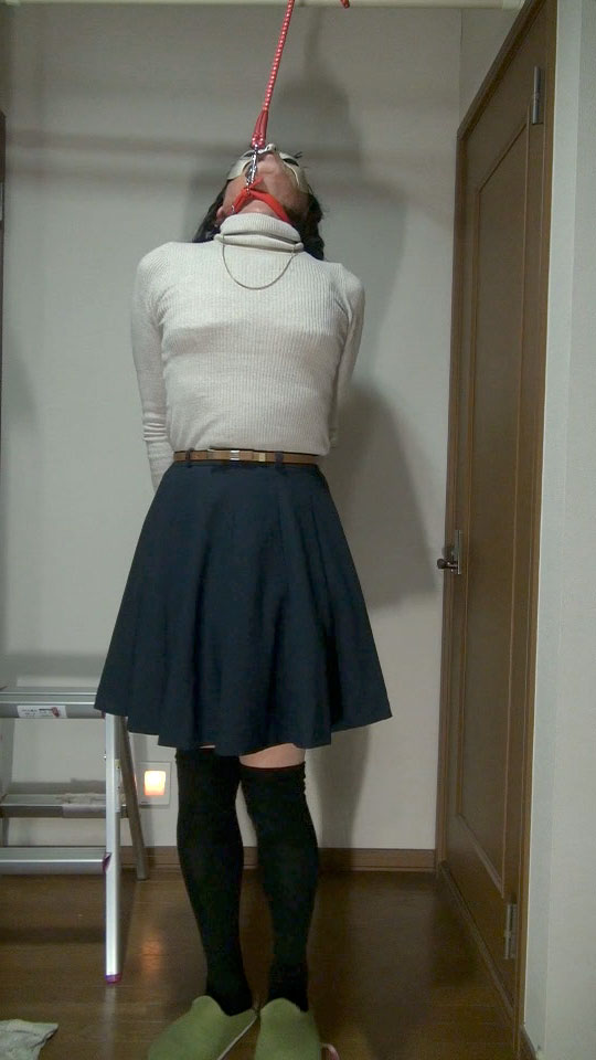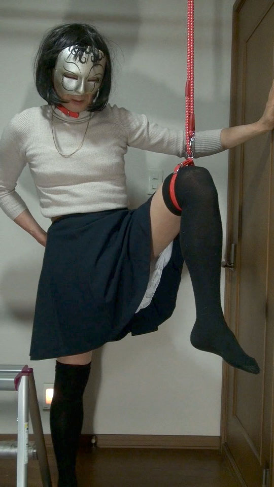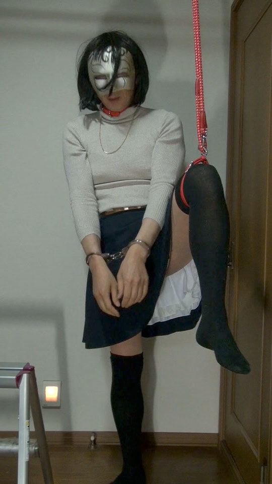 さんざん嬲られた後もこの姿勢で拘束され続けます。誰もいない拷問部屋...なぜかスカートの中でからだがつらくなってきて...ああ...もっと虐められたい...