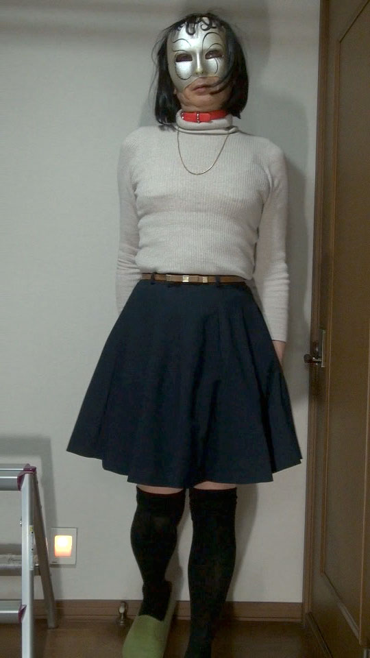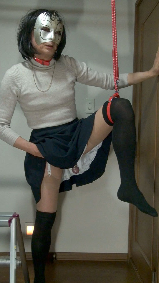 赤い首輪と赤い脚輪、紺色のフレアミニスカートと白いペチコート...スカートで隠されていたけど脚を吊り上げられて露わになる太ももの肌...そして...性器...