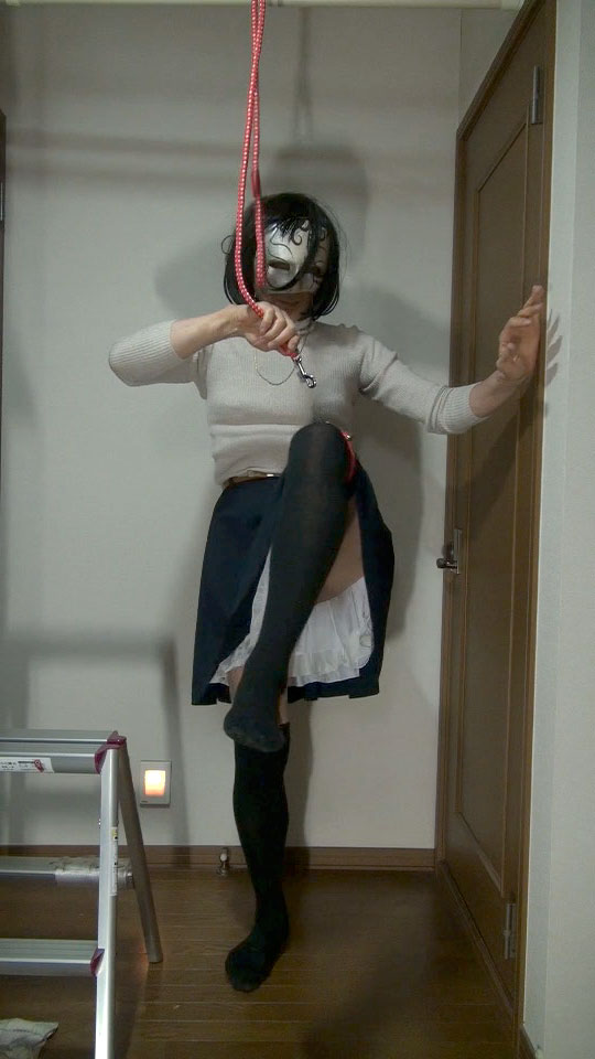 恥ずかしい秘密をスカートの中に隠した純子は、さらに片脚を高々と吊られる恥ずかしい姿勢を無理やり取らされるのでした。とても屈辱的な姿勢を強制される純子です...