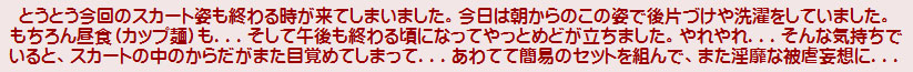 5月のスカート生活最後の日...この姿で後片づけをしました。時々道具を手にしたり雑誌を見たりしながら...