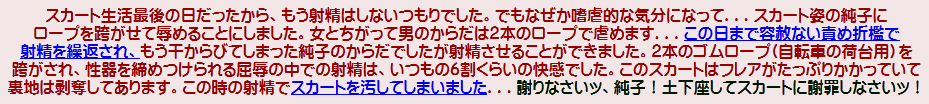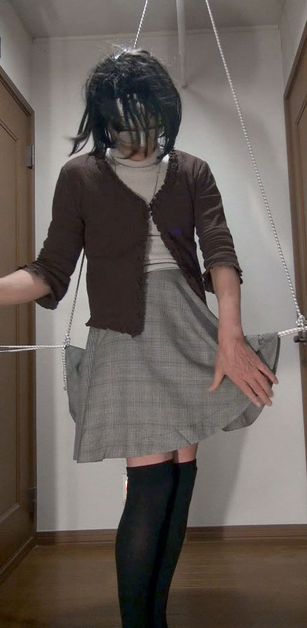 なぜか純子にスカート姿のままロープを跨がせてやりたくなって...恥ずかしい格好だわ。どんなふうに感じているか、外から見てもはっきり分かっちゃうから...