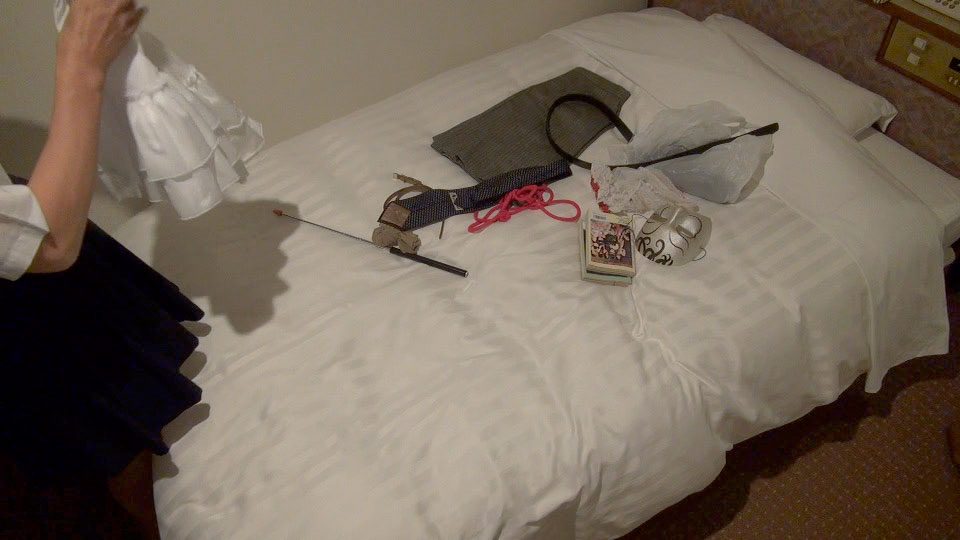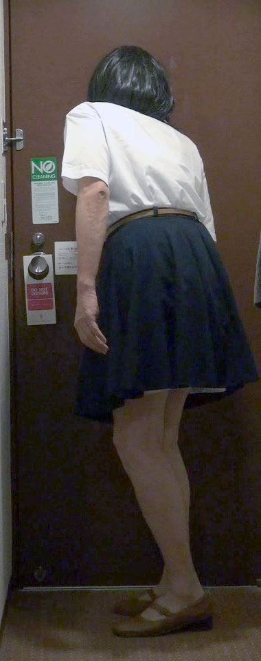 チェックインしてからまずシャワーを浴びて、簡易バージョンでスカート姿に変身しました。スリップにペチコート1枚、生脚の純子がベッドの上に革ベルトや