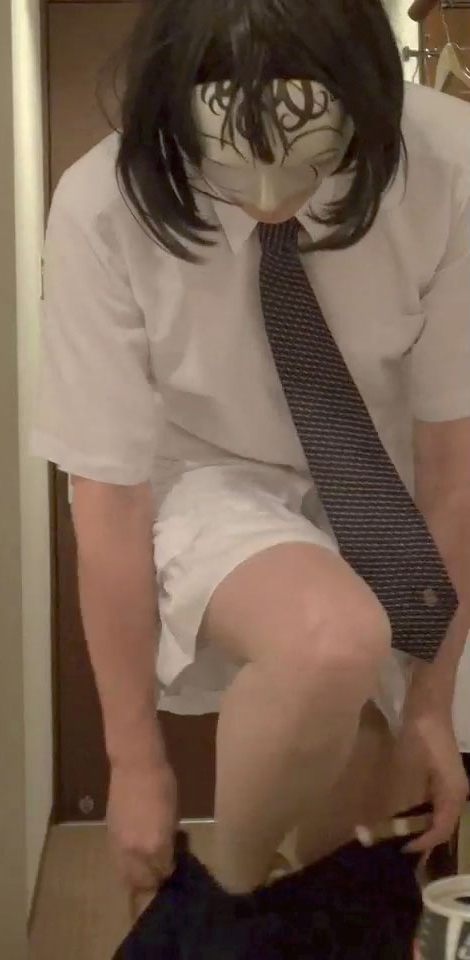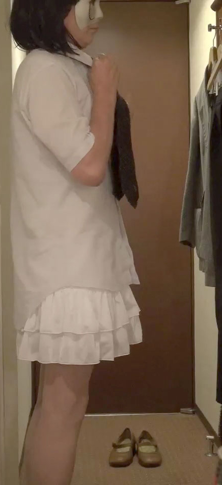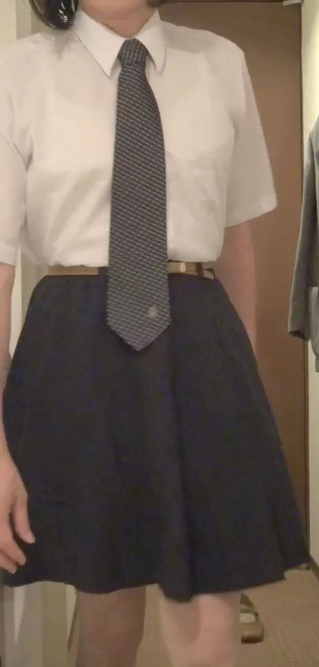 ペチコートの下に淫らな責め具を隠したまま来た時のワイシャツ+ネクタイ姿になりました。ただしボトムはズボンではなく紺無地のフレアーミニスカート...