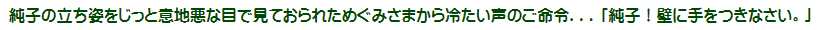 ああ...スカートの上から純子のウシロを見られているんだわ。このあとでめぐみさまから受けるきびしい尻責めを想います。とても恥ずかしい