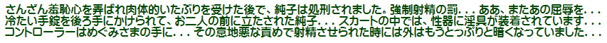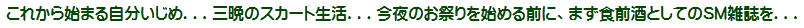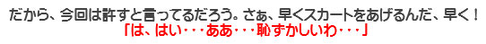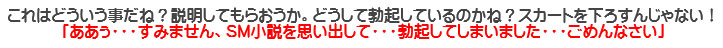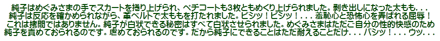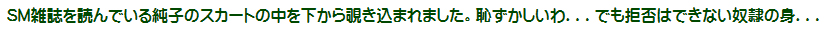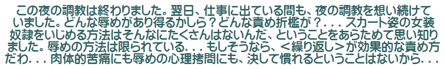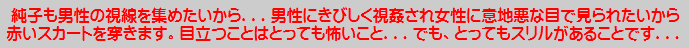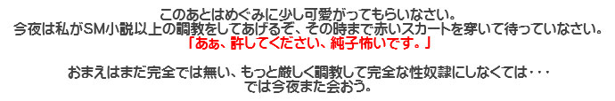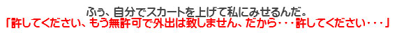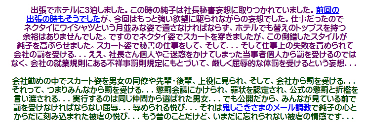 | 5月下旬から始まりそうな純子のスカート生活...断続的に2ヶ月くらい続きそうです。どんなふうに純子をいじめようかな。。。どんな拷問があるでしょう?純子を辱めるために... |