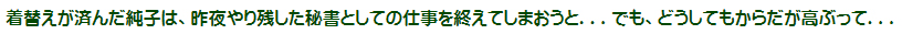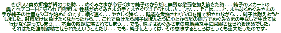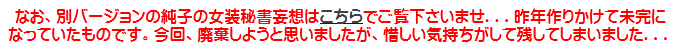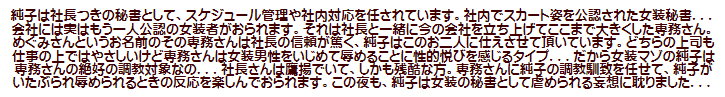 ![]() 陰湿で無残な紐遣い...2週間以上の射精禁止のからだに懲罰バンドと奴隷リングの淫らな責め折檻が加えられて... 下とは別バージョンの純子の女装秘書妄想はこちらでご覧下さいませ。<懲罰会議><社内引き回し>などの妄想... [2015.05.12] ![]() ![]() ![]() 画像をクリックすると大きな画像にジャンプします。 ![]() この日は移動日。ホテルに着くまで、とにかく早くスカート姿に変身したい!あの裾の感触を太ももに感じていたい!って...そればかり思っていました。 チェックインしてからまずシャワーを浴びて、簡易バージョンでスカート姿に変身しました。股縄をかけられ、スリップにペチコート1枚、生脚の純子です。 画像にマウスポインターを置くと裏画像が出ます。 ![]() ホテルでいいのはスカート姿でベッドやソファーに座れること。ごちゃごちゃの自宅とちがって、すっきりしていること。この夜もスカート姿でベッドに座り、 お気に入りのSM雑誌のバックナンバーを読みました。純子のマゾ心のツボを刺激する描写が、スカートの中のからだを虐められモードに高ぶらせます。 画像にマウスポインターを置くと裏画像が出て大きな画像にジャンプできます。 ![]() まだ生脚の純子です。見る立場からは、スカートの下にガーターベルトで吊ったストッキングが見えるとエロチックで楽しめますが、スカート姿の本人 としては生脚の方が、スカートやペチコートの感触を太ももに感じることができてとても刺激的...だから、つい生脚で時間を過ごしてしまいました... 画像にマウスポインターを置くと裏画像が出て大きな画像にジャンプできます。 ![]() でも時間は限られています。そろそろ正式のスカート姿に変身しなければ...今回のテーマというかモチーフというか、純子の頭の中に棲みついた被虐の 妄想にどっぷりと漬かるためには、きちんとした服装をしなければなりませんでした。ええ、それは女装の秘書として働き、懲罰を受け、辱められる妄想... 画像をクリックすると大きな画像にジャンプします。 ![]() スカートの裾から白いレースが覗いて見えるのって、とてもエロチック...純子は子供の時からそう思ってました。その時はペチコートというものを知らず、 スカートの下のスリップ(シュミーズ)を想像しながら淫らな自慰行為に耽っていました。その頃のことを思い出しながら、自分のスリップ姿を鏡に映します。 昔は裾が好きでしたが、今では裾だけでなくどちらかというと肩紐がとてもエロチックに思えます。ブラジャーと2対の肩紐...いかにも女性らしいから... 画像をクリックすると大きな画像にジャンプします。 ![]() スリップを脱ぎ、キャミソール+ペチコートという純子の定番スタイルに切り替わりました。ウシロはこの淫具で深々と犯され、前には懲罰バンドと 奴隷リングが嵌められて性器を締め上げられています。その前とウシロのみじめな感触が純子を興奮させました。ああ...性奴隷なんだわ... 画像にマウスポインターを置くと裏画像が出て大きな画像にジャンプできます。 ![]() ペチコートの下に淫らな責め具を隠したまま来た時のワイシャツ+ネクタイ姿になりました。ただしボトムはズボンではなく紺無地のフレアーミニスカート... 来る時にJRの中で思い描いていた正装でした。生脚ではなく、ストッキングをガーターベルトで吊っています。秘書としてふさわしいスタイルだと信じています。 画像にマウスポインターを置くと裏画像が出て大きな画像にジャンプできます。 ![]() この夜の純子の正装が整いました。こんなスカート姿で仕事をしたい...みんなに見られ、男性からはいやらしい目で、そして女性からは意地悪な 目で見られながら、秘書として勤務するの。そして就業時間後は、社長さんや専務さんから罰を受け、そして会社の共用性奴隷として調教されたいわ。 ![]() 画像をクリックすると大きな画像にジャンプします。(SM雑誌は大きな画像はありません。) ![]() ![]() ![]() ![]() ![]() ![]() ![]() ![]() ![]() ![]() ![]() ![]() ![]() ![]() ![]() ![]() ![]() ![]() ![]() ![]() ![]() 画像をクリックすると大きな画像にジャンプします。 ![]() 純子のスカートの中の淫らな責めを、めぐみさまはすべてご存知です。その上で、純子のスカート姿を楽しまれています。恥ずかしい...そんな 純子の羞恥心を弄ぶように...そして純子にこれからの陰惨ないたぶりと辱めを予感させて楽しんでおられます。純子はめぐみさまの性奴隷! 画像をクリックすると大きな画像にジャンプします。 ![]() スカートで隠した純子の淫らな欲望...被虐の歓びをむさぼろうとする純子の淫らな欲望がさらけ出される瞬間...めぐみさまの意地悪な棒で 純子の恥ずかしい欲望が社内で晒しものにされる瞬間...この時、純子の性奴隷としての身分は決定的なものになりました。もう戻れない... 画像をクリックすると大きな画像にジャンプします。 ![]() スカートもペチコートも捲り上げられて性器を剥き出しにされ、亀頭のくびれを紐遣いで虐められ