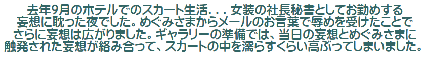 | 今回のギャラリー更新で、手持ちの未公開映像はなくなってしまいました。次はいつスカート姿になれるのかしら?...5月下旬から一ヶ月以上にわたるスカート生活があるかも... |