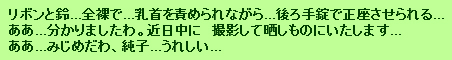 また吊られている純子です。ただ今、ちょうど手錠をかけられて晒しものにされているところ...純子の被虐妄想の世界では、純子の拷問はこれから始まるの...