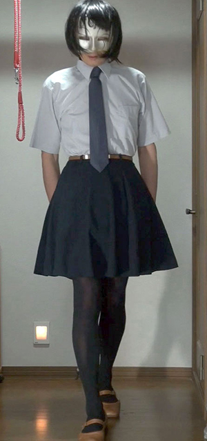 紺色のフレアーミニスカート...トップスは男物の半袖白ワイ+ネクタイ...ちょっと倒錯的だけど、いちおう普通のスカート姿。でもその下は...