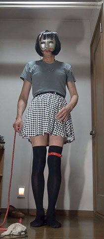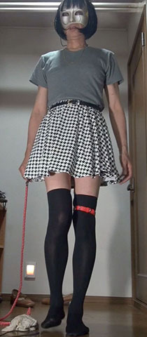 スカートの裾から伸びる細身の蛇...後ろで股縄に繋がれたロープです。会陰部を自分の体重65キロで蛇のように締め上げられるつらさ...ああ...高ぶってしまうわ...