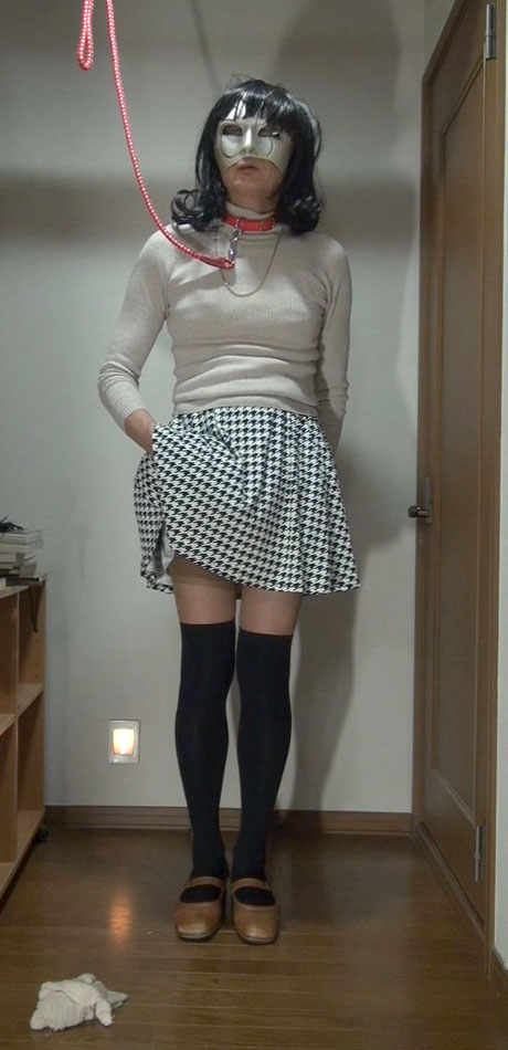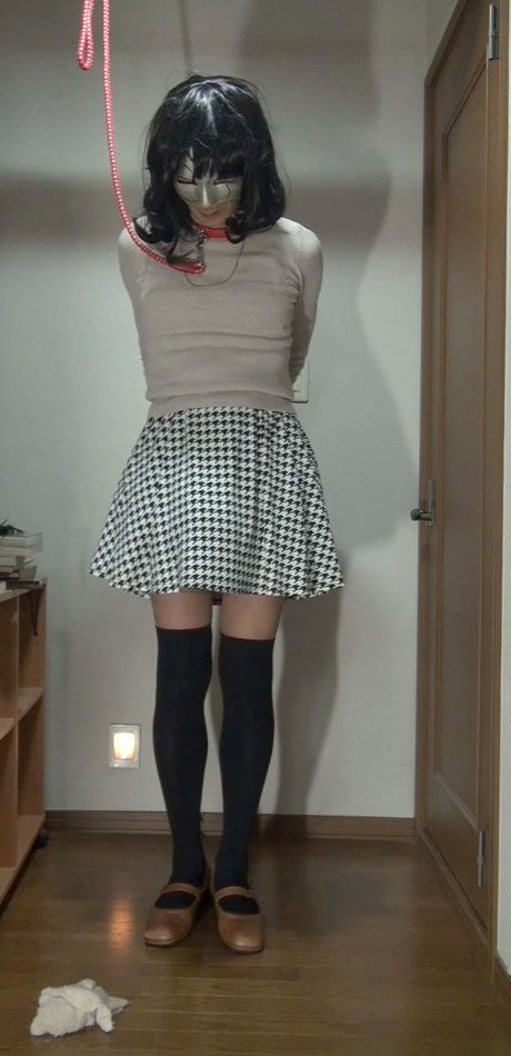 純子の処刑が始まります。赤い首輪を嵌められ、それをリードで天井に繋がれました。もう逃げられない...急所をはずして性器根元に嵌められた淫具の責めが始まりました。