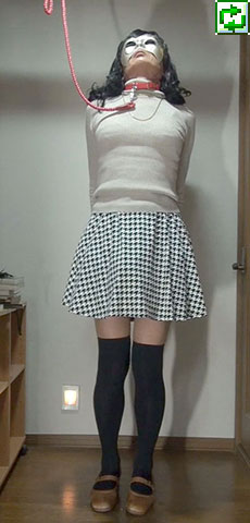 純子の処刑が始まります。赤い首輪を嵌められ、それをリードで天井に繋がれました。もう逃げられない...急所をはずして性器根元に嵌められた淫具の責めが始まりました。