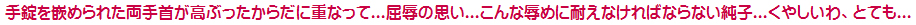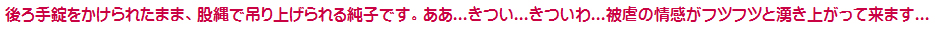 ああ...こんなこと...吊られたまま性器を検査される純子...辱められる純子...吊られたことで妖しく高ぶったからだと心が晒しものに...