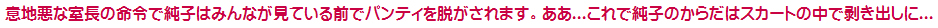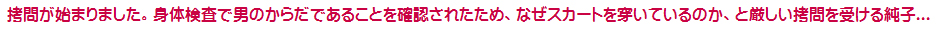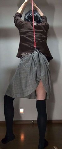 吊られたままスカートを捲り上げられ、ペチコートを1枚ずつ検査されていく純子です。ああ...恥ずかしいわ...そして...次に...