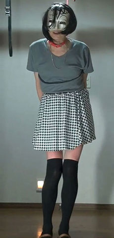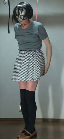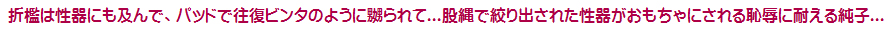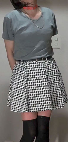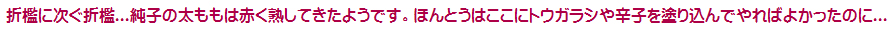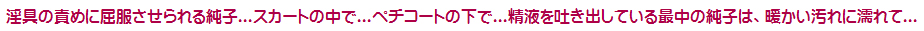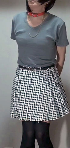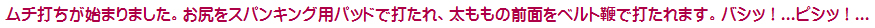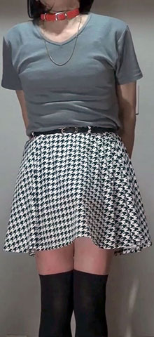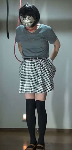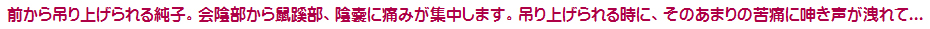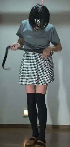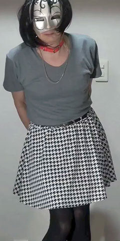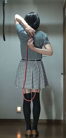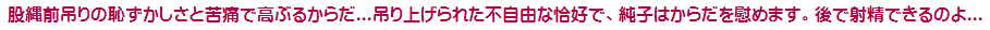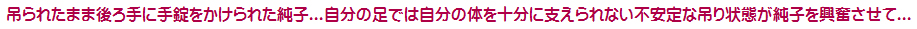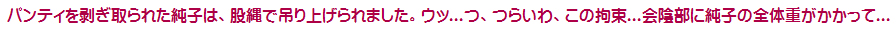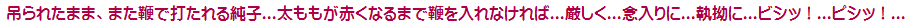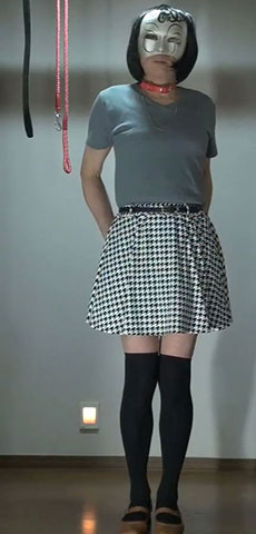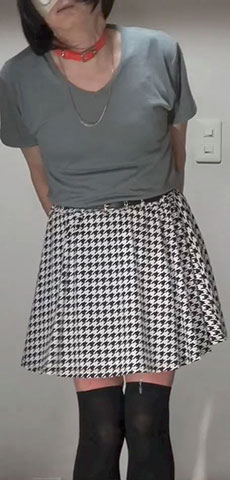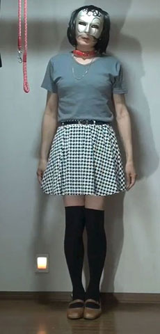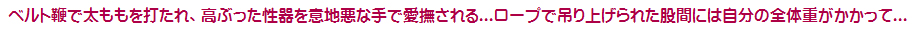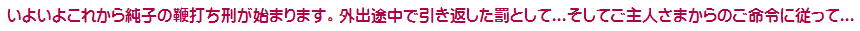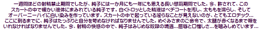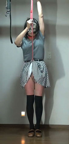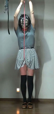 ![]() 外出から帰ったばかりの純子です。この格好で風の強い夜の住宅街を歩いて来ました。こんな短いスカートで風の意地悪を受けて来たんだわ... gaishutsu_shippai_no_batsu1M.mov ![]() グラフをクリックすると元データをご覧になれます。 ![]() ![]() ![]() 純子はまずパンティを剥ぎ取られました。スカートは残され、下着は剥奪される...なぜ?...それは...それは、純子を辱めるため...みじめな思いをさせるため... ![]() スカートの中で会陰部を厳しく締め上げる赤いロープの股縄...その背側にフックをかけられて吊り上げられる純子...会陰部から肛門にかけて痛みが集中します... gaishutsu_shippai_no_batsu2M.mov ![]() スカートもペチコートも捲り上げられて剥き出しにされた下半身を鞭やパッドで打たれるのは、肉体の苦痛より屈辱・恥辱の思いの方がつらい...バシッ!...ビシッ!... ![]() だんだん太ももが赤くなってきました。今はムチ打たれていないのに、太ももにヒリヒリする痛みの感覚があります。ああ...折檻されているんだわ...甘美な痛みです... gaishutsu_shippai_no_batsu3M.mov ![]() 赤いロープ1本で吊られている純子...自分で自分の姿勢を保つことができずに左右前後に揺れ動く体がとても心もとない気分です...自由を奪われて...苛められて... ![]() スカートの下に隠された赤いロープの股縄...きつく締め上げられ、搾り出された性器が恥ずかしく勃起しています。股縄の屈辱的な感覚が純子を高ぶらせるの... gaishutsu_shippai_no_batsu4M.mov ![]() スカートの下にペチコートを3枚重ねています。純子の前を吊り上げるロープでスカートが左右に割れて白いペチコートが見えています。この奥には敏感なからだが... ![]() 太腿もだいぶ赤くなってきました。ヒリヒリ火照っています。でも、まだダメッ!もっと...もっと苛めて...そんなことを思いながら、太腿をいやらしく愛撫する純子です... gaishutsu_shippai_no_batsu5M.mov ![]() 赤い首輪は奴隷の証し...辱めに高ぶったからだをさらに苛め抜かなければならない惨めな性奴隷の証し...苦痛と屈辱の思いで、恥ずかしく勃起した性器がつらい... ![]() スカートの中で淫具が性器に装着されました。本来このバイブレータは処刑用ではなく焦らし用なのですが、久しぶりの射精なので、これで純子を生殺しにしながら... gaishutsu_shippai_no_batsu6M.mov ![]() スカートの中で最終的に迫り上げられて行く純子です。久しぶりの射精...ああ...もうすぐだわ。もう純子、耐えることはしない!...思い切り快感に身を任せていたい... ![]() ウッ...ああ...スカートの中で射精が始まっています。純子、恥をかいている最中です...ああ...見ないで...こんな純子の顔...お願いです、目をつぶってて...ウッ...また... gaishutsu_shippai_no_batsu7M.mov ![]() |