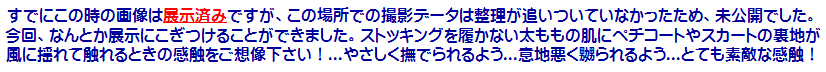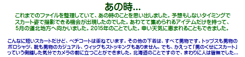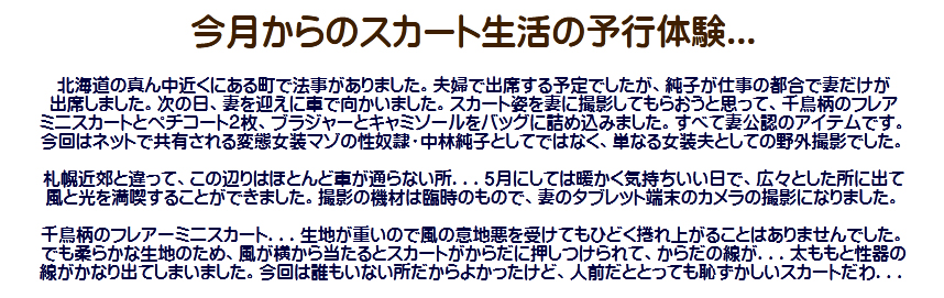 ![]() [2015年5月の体験記録です。] 右下の画像、ぜひ大判でご覧になって下さいませ。純子のスカートの部分...大判だと太ももや性器の線がとても生々しく感じられません?... ![]() オーバーニーハイの上は生脚です。ガーターベルトが手元になかったから...でも、かえって生脚の方が風にくすぐられる感じでよかったわ。 ![]() 広々とした場所でスカート姿の純子が光を浴び風に吹かれています。太ももに当たる風と触れるスカート・ペチコートを感じる開放感!... 急な成り行きでの撮影でした。ありあわせのアイテムでスカート姿に変身して、ありあわせの機材で撮影しました... 純子としてはたくさんの不満が残る撮影行でしたが、ついで、というか急な付け足しだったから仕方ありません。まさに 「男のくせにスカートなんか穿いて」っていう感じの画像ばっかり...でも、さわやかさだけは分かって頂けるでしょうか? この下の写真はこれ以上大きくなりません。ごめんなさい... ![]() ![]() ![]() ![]() ![]() ![]() ![]() ![]() 下の2枚は大判があります。画像をクリックしてご覧になってみて下さいませ。 ![]() ![]() ![]() ![]() 恥ずかしいくらい短いスカートが風に弄ばれて体にまとわりついています。そのスカートの下で...重ねたペチコートの下で、私のからだはどうしようもなく高ぶっています... ![]() |