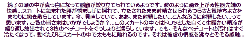 このスカートの中...3枚の白いペチコートの奥に隠された純子の秘密...スカート姿を外から見るだけでは絶対に分からない...純子がスカートを捲らない限り...