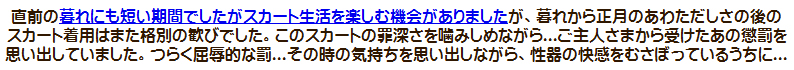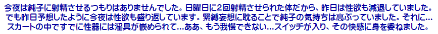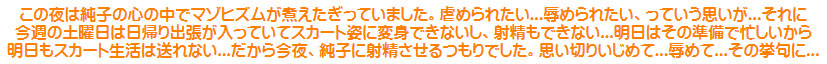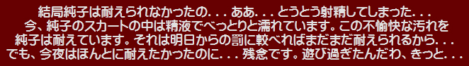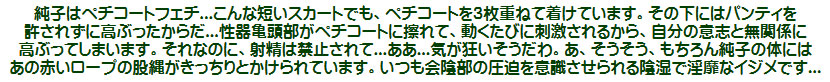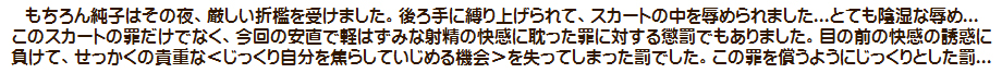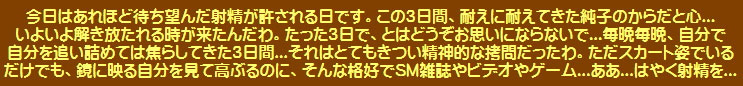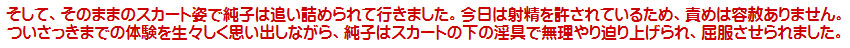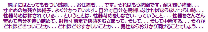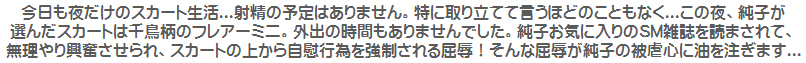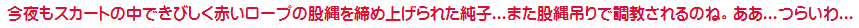 ![]() ![]() スカートの下では赤いロープの股縄がきっちりとかけられています... ![]() 純子は勝手に射精することを禁じられた性奴隷の身です。許されているのは寸止めオナニーまで...でもこの夜はどうしても射精したかった...射精してしまいたかった... ![]()