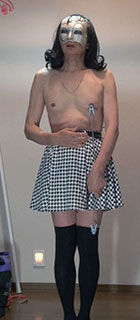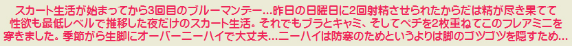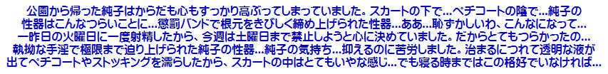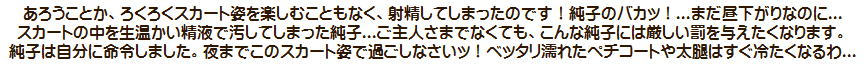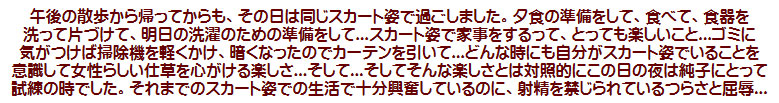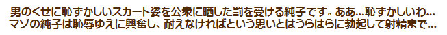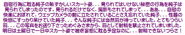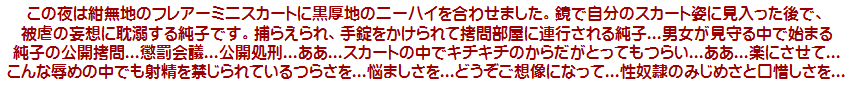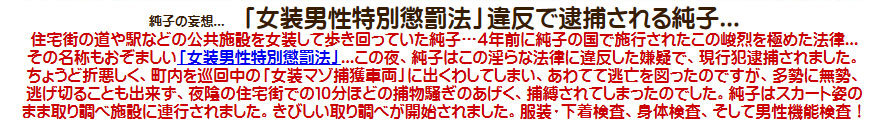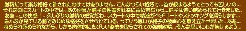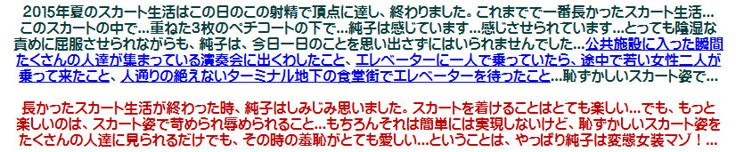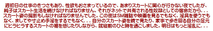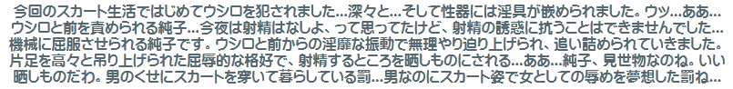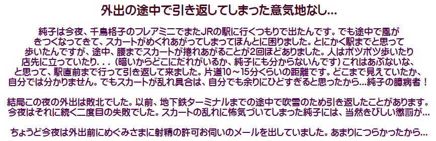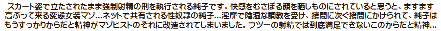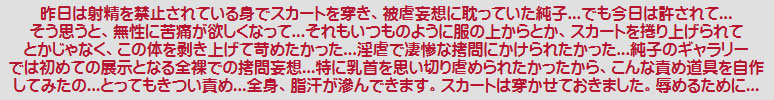 ![]() ![]() ![]() スカート姿に着替えただけで満足しちゃって...横になって軽い自慰行為を撮影しておくだけのつもりでした。でも気がつくと、精液らしいものが吐き出されていました... ![]() ![]() 純子のスカートの中でペチコートが濡れているのが分かります。真っ白なランジェリーに残された男の精液の汚れ...無残だわ。このままでスカート生活を続けるなんて... ![]() ![]() 意地悪バーを跨がされている時に、足を引っ掛けて落としてしまいました。懲罰ポイント300点...ああ...ドジな純子、これまでにも増して厳しい折檻を受けるのね... ![]() ![]() ああ...気持ちいい...もっと...もっと...ウッ!...アアーッ...純子は目をつぶり、目を開けて、射精の快感の波に耐えています。頭の芯が溶けてしまいそう...ウウッ... ![]() スカートの中では性器が痙攣して精液を放出し、純子のペチコートを濡らします。純子の太腿と靴下を白い汚れが濡らしています。ウッ...また次の快感の波が... ![]() ![]() ![]() 途中の無人駅に立ち寄った時...ウィッグは持てませんでした。トイレへ入る時は、念のためこの上からズボンを穿きました... ![]() ![]() 季節がらストッキングまではいらないと思い、生脚にオーバーニーハイを履きました。太腿がペチコートで擦れて気持ちいい... ![]() ![]() スカートを風で体に押し付けられると、男性はこんなふうになるんですね♪...太腿だけでなく股間の膨らみがはっきりと出てしまう... ![]() |