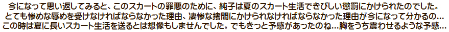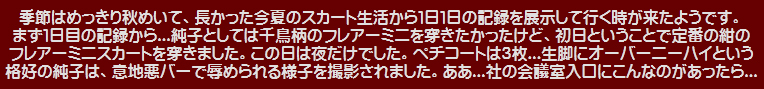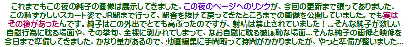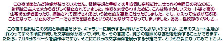 ![]() ![]() 公園で撮影した映像と画像は、一部すでに展示済みでこちらのページでご覧頂けます。今回、公園から帰ってからと夜の撮影分を追加しました。 ![]() ![]() 公園から帰って手淫に耽るスカート姿の純子は、公園の時と同じ服装です。懲罰バンドで締め上げられた性器がとってもつらい...ああ...触らないで...見ないで... ![]() この格好で風の意地悪を受けていたんだわ...編集しながらそう思うと、無性にこの純子を苛めたくなってきます... ![]() スカートの下で重なるペチコート...スカートの中の空間を埋めて、恥ずかしい体を守ってくれるけど、真下からの攻撃には... ![]() ![]()