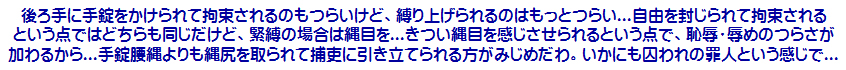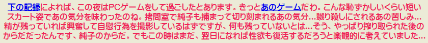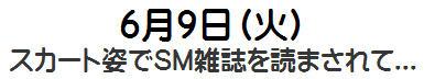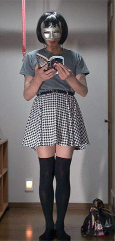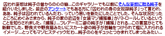 ![]() ![]() ![]() 左上のスカート姿でご近所を歩いてきました。丈が極端に短くないから、歩いていても安心でした。生地の薄さは少し不安だったけれど、風もなかったから... ![]() ![]() 部屋に戻ってからは生け捕り・拷問妄想でした。SM雑誌を読まされ、股縄で吊り上げられ、手錠で引き回され、性器を嬲られました。そして...辱めを受けました... ![]() [2016.10.13] |