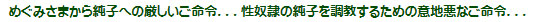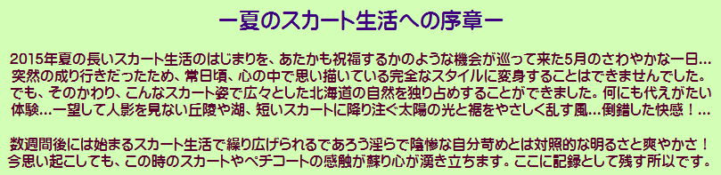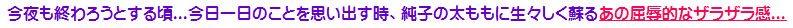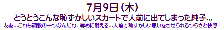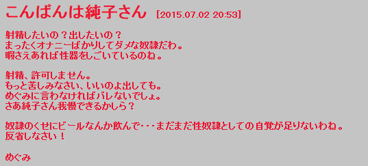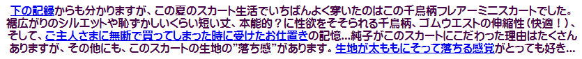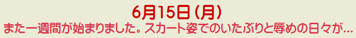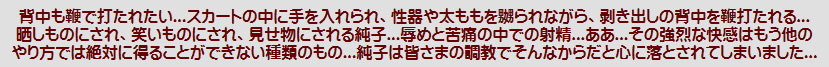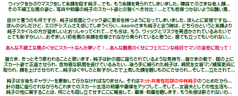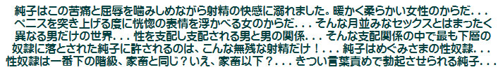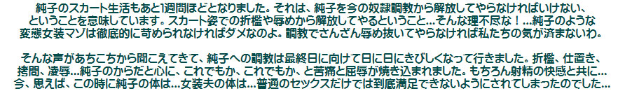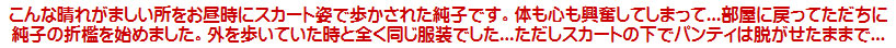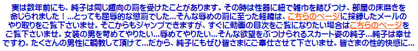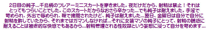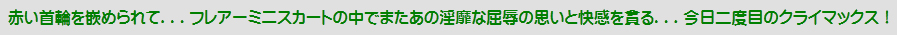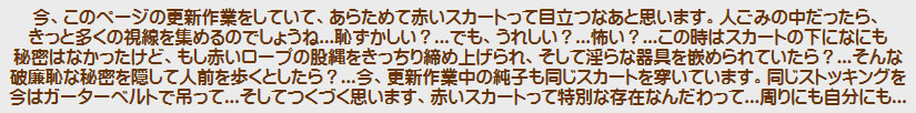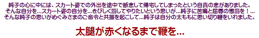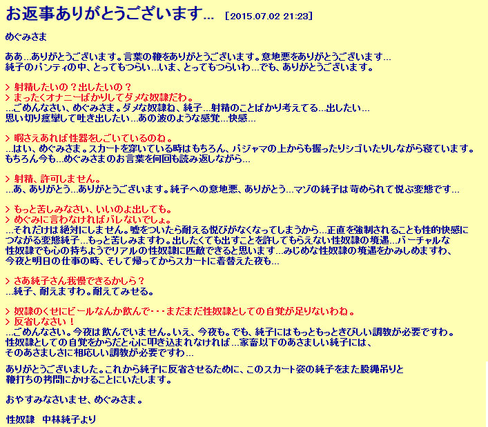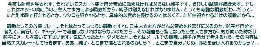 ![]() ![]() 純子の誓いの言葉をお聞き下さいませ... ![]() ![]() 奴隷記念日を祝う純子の口上はこちらでした。今回追加した画像はこちらです...ああ...恥ずかしいわ... ![]() ![]() こんな恥ずかしいスカートで歩かされるなんて...辱められているという意識が純子を高ぶらせました。帰ってからの折檻...それでも射精は許されない身... [2016.06.30] |