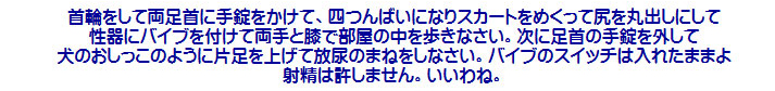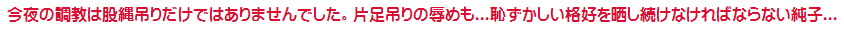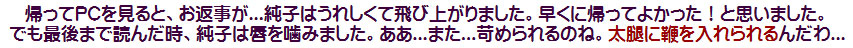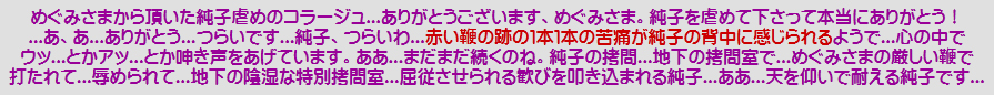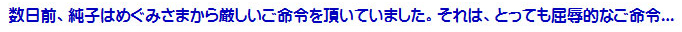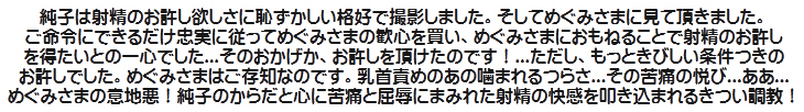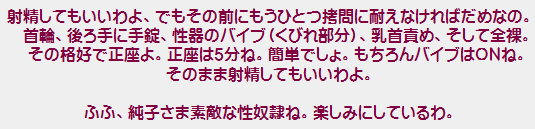 「もし歩いている時に錘を落としたら辛い鞭打ちが待っているわよ。」...ああ...はい... わかりましたわ、めぐみさま...その時にはどうぞご存分に純子を...純子のからだを... ![]() こちらでお確かめ下さいませ。ご命令に服従している純子です。ご褒美を...お願い...
