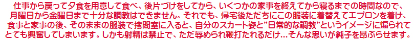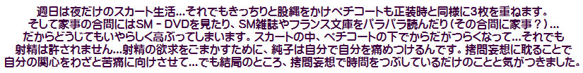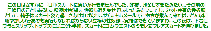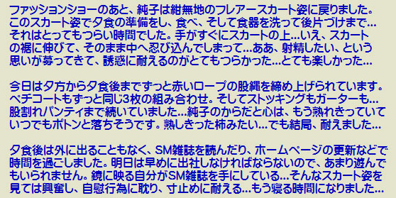 ![]() ![]() ![]() 高ぶったからだをスカートの上からペチコート越しに慰める純子...射精を禁じられて、とてもつらいの... ![]() 射精を禁止された夜...スカート姿で夕食を終えたあとの時間がとてもつらい...自分のスカート姿を鏡に映されながらSM雑誌を読まされ、SM動画を見せられて... ![]() ![]() 純子のブラウス、ボタンとボタンの間から出ているコードは、右の乳首に当てられたローターのコントローラです。もちろんスイッチオンの状態です。ああ... ![]() [2017.05.17] |