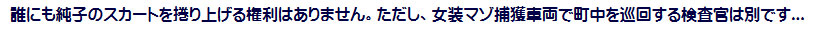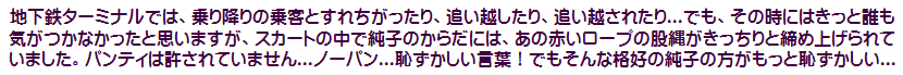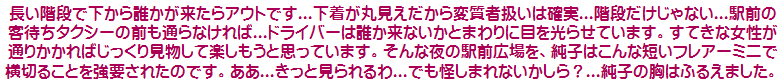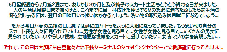 ![]() [2016.08.23] ![]() ![]() 駅の階段やオフィスの踏み台などで女性のスカートを軽く見上げるような時...この奥は?...そんな淫らな好奇心が湧いてきます。もちろん何もできないけど... [2016.08.23] ![]() ![]() 純子が向かった地下鉄駅の構内には、痴漢や不審者に注意するように、との警告が至る所に掲示されています。そんな所を変態女装マゾの純子が歩きます... ![]() ![]() ![]() ![]() [2016.08.10] |