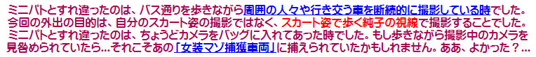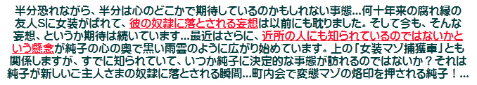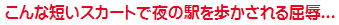 ![]() ![]() ほんとは純子自身よりも純子を見る人々の視線や反応(無視や不審視、そしてもしあるならばわいせつな視線)を写したいのですが、 どうもそれは無理なようです。それでも、それとなくすれ違う人や行き交う人々を撮影して臨場感を出したいと心がけている純子です... ![]() 男のくせにスカート穿いて...でも、もう怪しまれてもいい...通報されて、またこのスカート姿で職務質問の辱めを受けてもいい...最後の日、そんな気持ちもどこかに... ![]() ![]() 屈辱の公開処刑...めぐみさまをはじめ皆さまの審判により、極刑に処せられる純子...こんな所で無残な晒しものにされて、性奴隷であることを思い知らされて... 右後ろのマスクをした女性は、きっとこれから純子の前に回ってジロジロと純子の顔を見るでしょう。左後ろの老夫婦や座っている女性も集まってきます。ああ... ![]() 純子自身のスカート姿を写すより、スカート姿で町中を歩いている純子が見た風景や、できれば見られている純子を想像できる映像を撮りたかったのですが... ![]() 外出の時と同じスカート姿で被虐の妄想に耽る純子...捕えられ、下着検査の辱めを受け、そして後ろ手錠で拘束されて引き回しにかけられる...ああ...恥ずかしいわ... ![]() スカートの中で淫具の責めに屈服させられる純子です。もう二度とこんな快楽を味わうことはない...そう思うと、その辛さが射精の快感を増幅して...ああ...女装マゾ! backhome3M_personal.mov [2017.06.08] ![]() ![]() スカート姿で夜の道を写しながら歩き回りました。向こうから人が来たらカメラをバッグに隠して...純子のスカートの中では淫具が動いています... ![]() ![]() 外出した時のスカート姿と持ち物のままカメラの前に立たされる純子...今夜はこれから訊問でさんざん辱められるんだわ...どす黒い期待に胸が高まって... ![]() 刺激用の淫具がスカートの中で性器に装着されて、”検査”が始まりました。いやらしい視線がスカートやペチコートを通り抜け、からだに突き刺さります。 ![]() SM雑誌を音読させられながら、スカートの中で陰惨な責めを受ける純子...心ならずも性玩具に屈服させられて射精する姿を晒しものにされる純子です... ![]() [2017.06.08] |