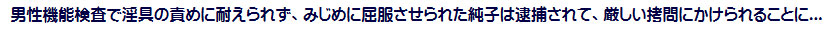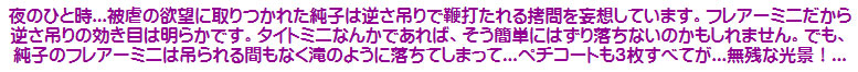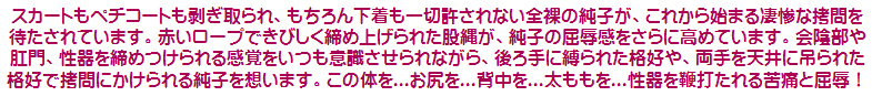 ![]() ![]() ![]() 恥ずかしいフレアーミニスカート姿の純子が後ろ手錠で拘束され、赤いロープの股縄で吊り上げられています。性器亀頭のくびれには淫具が嵌められ、 意地悪な振動が純子をいじめています。性器の根元は懲罰バンドできびしく締め上げられ、会陰部は股縄で圧迫されて自分の体重で責められています。 ![]() ![]() ![]() ![]() 一日が始まったばかりなのに、さっそく調教される純子...股縄をきつく締め上げられるだけでも屈辱なのに、さらに吊り上げられ、お尻をスパンキングされるなんて!... ![]() ![]() とっても長い時間...射精できるのは夕食後の調教が終わってから...ああ...それまでどうやって射精の誘惑に耐えればいいの?こんなスカート姿で辱められながら... ![]() ![]() ミニスカートの中で淫具に屈服させられる純子...射精のつらさと快感に体をよじらせて耐えたいのに、股縄できびしく吊り上げられているので、それも許されません... ![]() [2017.02.03] |