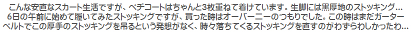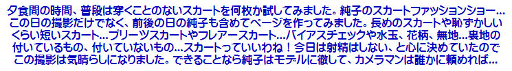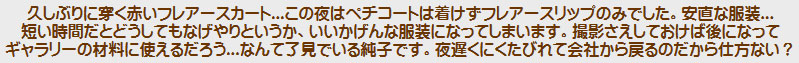 ![]() ![]() ![]() この夜はペチコートもキャミソールも着けませんでした。ブラとフレアースリップに白ソックスという簡易バージョン...(それがふつう?...) このスカート姿の純子は、すでに6月のファッションショーとして展示してあります。残念ながらそれ以外に展示できそうな画像はなさそうです。 [2015.12.22] |