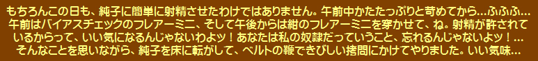 ![]() ![]() ![]() 朝起きてから朝食前後までは、このバイアスチェックのフレアーミニスカートで過ごしました。もちろんパンティは許されていません。今日は射精できると思うと... ![]() ![]() 現実生活では絶対にあり得ない光景...でも、町行く女性のすてきなスカート姿を見ると、つい想像してしまうイメージ...こんな妄想に耽るのは男性だけ... ![]() ![]() 今日は最後には射精できるんだ...そう思うと拷問ごっこにも力が入ります。もっと打ってやる...シマウマみたいに鞭痕を刻みつけてやるわ...って... ![]() ![]() こんな格好で射精中の純子です。スカートの中で性器が淫具に責められて、無理やり追い詰められてしまいました。首が苦しい...でも気持ちいい... ![]() [2016.03.03] |