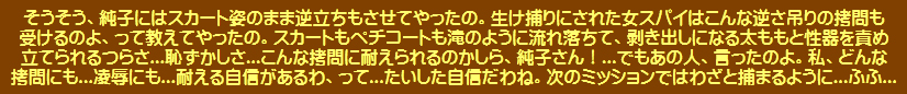 ![]() ![]() ![]() きびしく縛り上げられたスカート姿の純子が立たされています。首輪で繋がれた恥ずかしい格好で晒しものにされているの... ![]() こんなふうに縛られてしまったらもう何も抵抗できない...スカートの上からからだを嬲られても...スカートの中をどんなに蹂躙されても... ![]() みんなが見ている前を引き立てられるスカート姿の純子...手錠が無残だわ...生け捕りの女企業スパイ...こんな恥ずかしい格好で拷問室へ引かれて行くのね... ![]() こんな短いフレアスカート姿で手錠をかけられ、腰縄を取られて社内の各フロアで引き回しにかけられます...企業スパイとして捕らえられ、その見せしめに... ![]() [2016.10.26] |