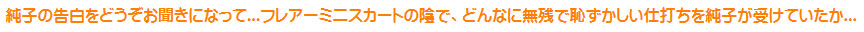 ![]() ![]() ![]() 太ももにすえられたお灸は期待はずれで、それほど苦痛ではありませんでした。でも一つ、陰茎の根元にすえた灸は徐々に効いてきてすごかったわ...拷問よ... ![]() 昨日の出張目的だった会議の席を思い出しました。こんな恰好でみんなの前に立って話をしていたら...ああ、想像するだけで恥ずかしいことだわ、むごいこと... ![]() 清楚な紺無地フレアースカートの中で純子の性器は高ぶっています。それは誰にも分からないこと...純子のスカートの中を覗く権利は誰にもないんだから... ![]() ![]() 夜の部です。お色直しをして、千鳥柄のフレアーミニに...こんな短いスカートを穿かされている...そう思うだけで純子は高ぶってしまいます。下からも覗かれて... もっと恥ずかしい画像を...どうぞ...ああ、こんなこと... ![]() ![]() スカート姿で逆さ吊りにされた恥ずかしい格好で太ももやお尻を打たれた純子...拷問が中断して放心状態で座っています。でも拷問はまもなく再開されて... ![]() 〔更新2016.04.06〕 |