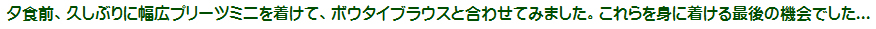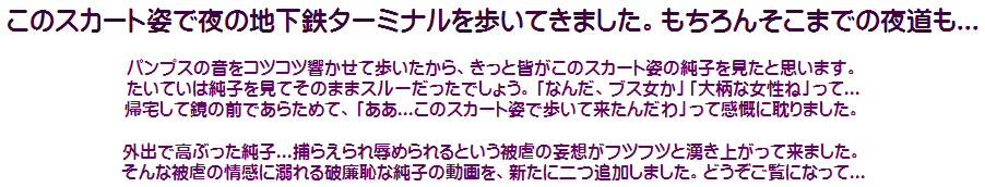 ![]() ![]() 上の衣装で昼食から夕方までを過ごしました。動画を編集したりSM雑誌・DVDを見たり、鏡に映る純子を見たり...そして夕方、とても原始的な手淫で屈服させられて... ![]() ![]() ![]() もう1年以上穿いていなかったスカート...プリーツスカートは久しぶりでした。ふと思い出して、撮影のために...でも、めぐみさまを刺激してしまったみたい... 「オフィスからの帰り道、ちょっと肩が当たって・・・壁際に追い詰められ囲まれて、フフフ、おもしろいわ。」 こんなスカート姿で男たちに追いつめられて...めぐみさまの妄想の中できびしく苛められる純子です...ああ...これから男たちに順番で辱められるんだわ... ![]() ![]() [2016.09.28] |