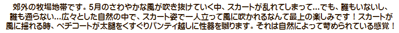(ちょうど今頃の季節でした...でもあの日と違って今日はとっても風が強いのよ。下の画像にマウスポインタを置いて頂ければ、草木の揺れの激しさが分かります...) ![]() ![]() 風が強い日でした。草だけじゃなく高い木々も音を立てながら大きく揺れていました。純子、こんな所でフレアーミニスカート姿で撮影したんだわ...