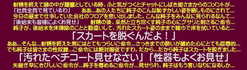射精の快感に酔い痴れたあとの純子...精液に汚れたペチコートやストッキングを晒しものにさせられるという辱め...男性なら誰にも分かる屈辱...みじめさ...