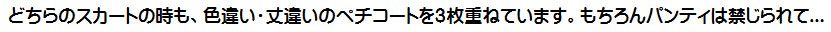 この日は、一番下の短いペチコートをフレアからプリーツに替えてみました。細かい襞がやすりのように性器亀頭や剃毛された陰嚢を擽るから、とてもつらいの...