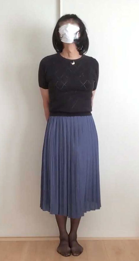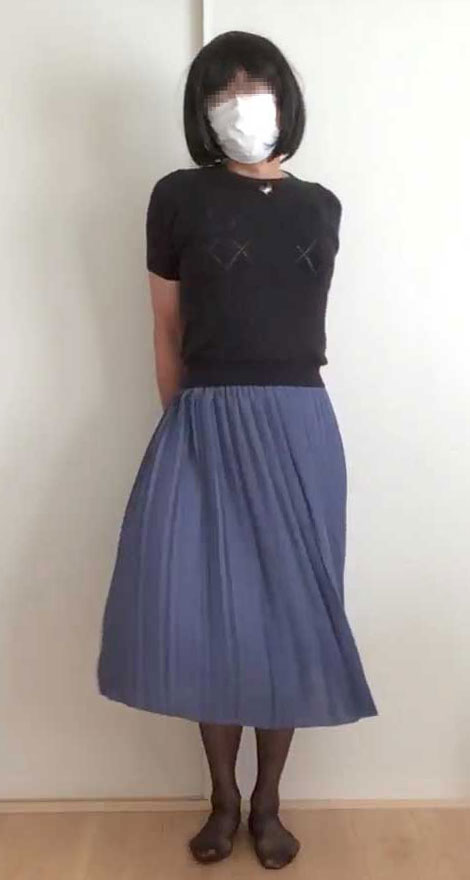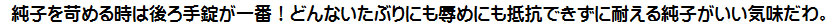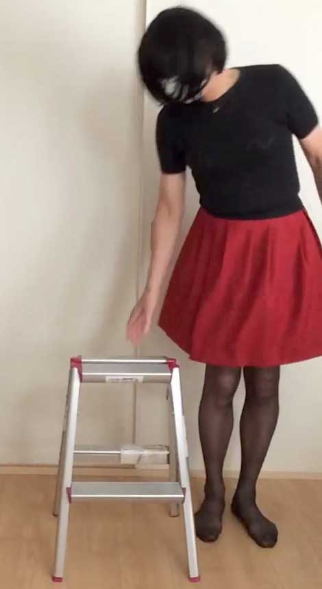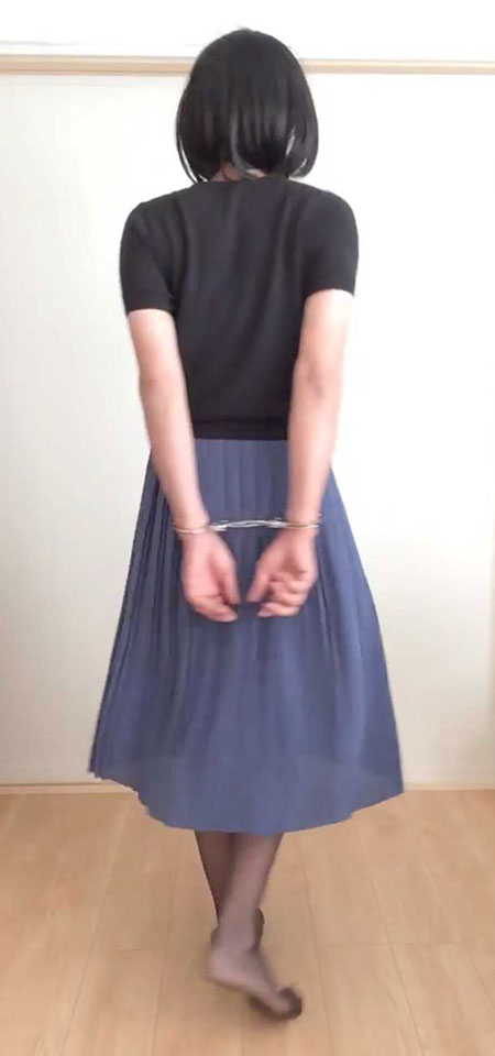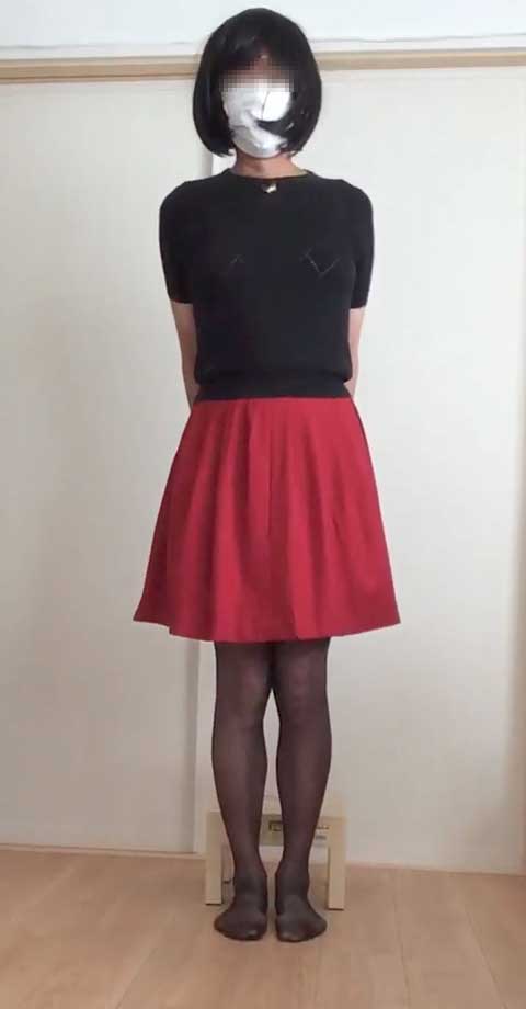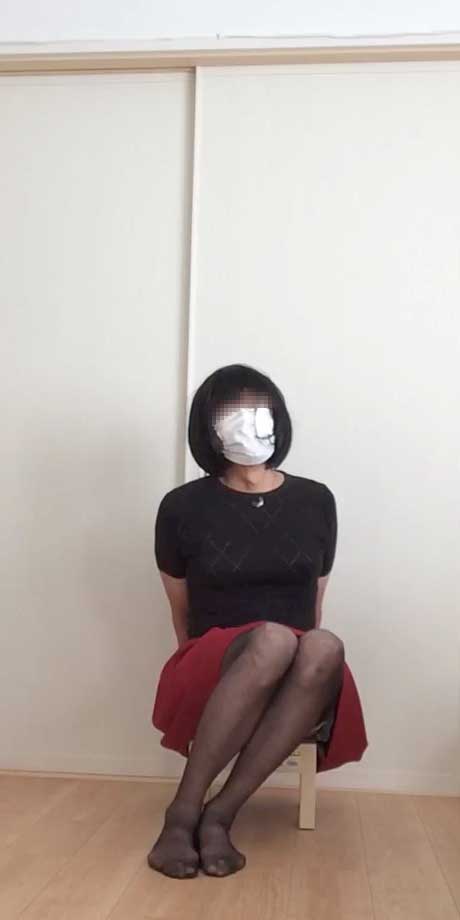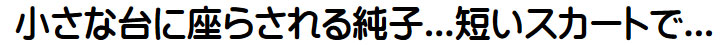 後ろ手錠をかけられたまま、低い台に座らされた純子です。ミニスカートだから、裾をつまんでスカート後ろに引かなくても、座ると自然とお尻が直に椅子に触れることに...