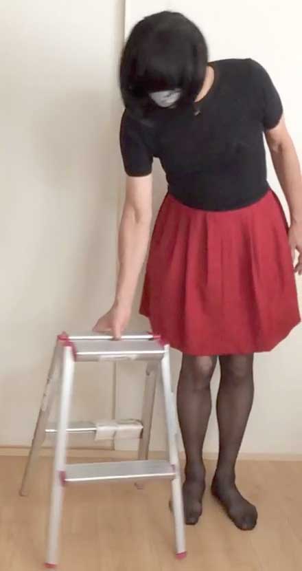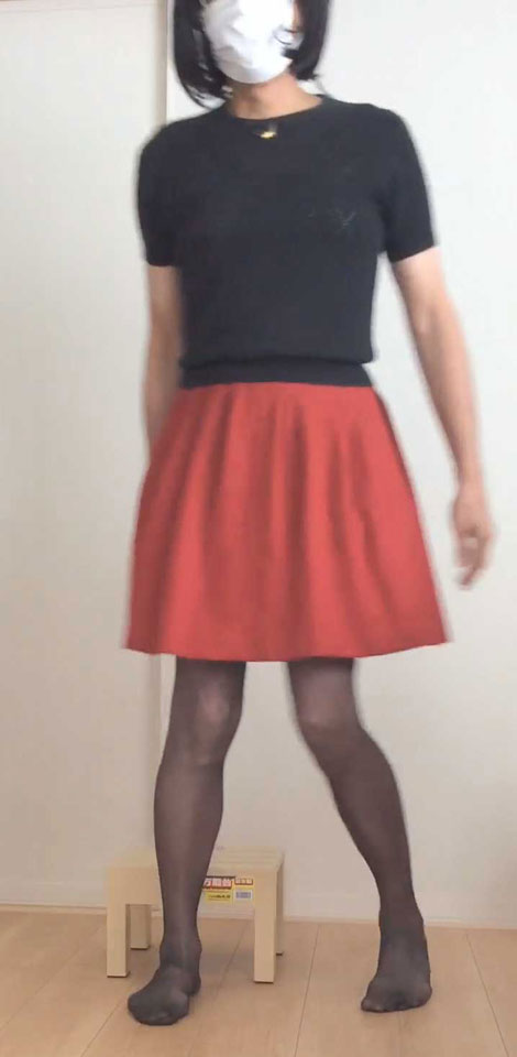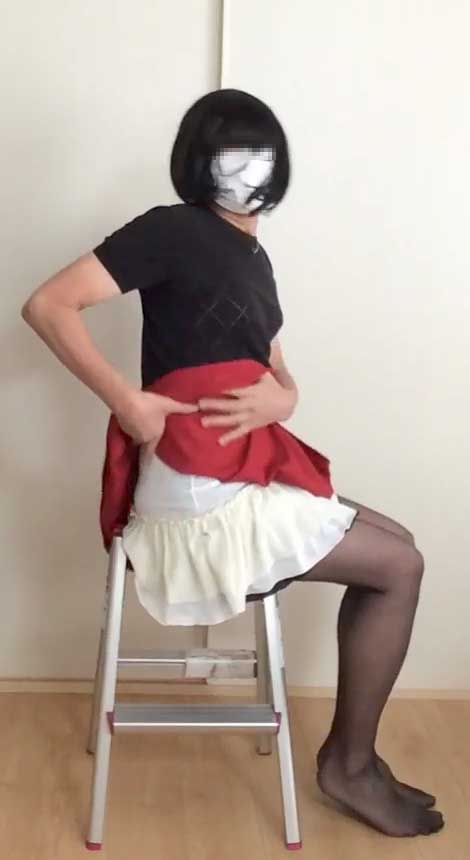 長いスカートを椅子の背にかけて座ります。柔らかい生地のスカートが描くエレガントな曲線がとっても女性的...でも、その中では?...誰も知らない背徳的な感覚!