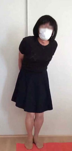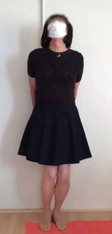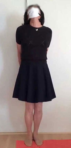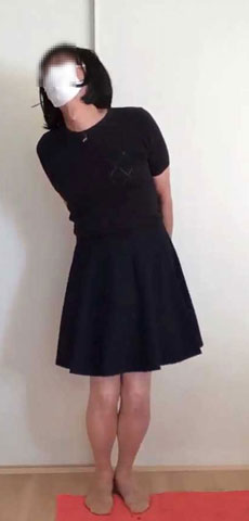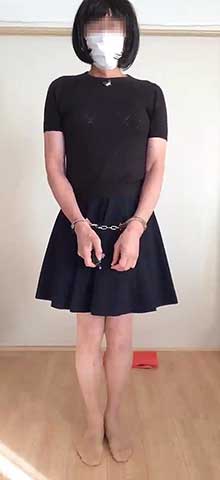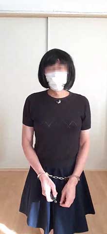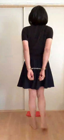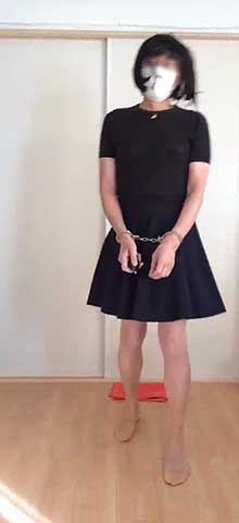 両手首には背中で冷たい手錠がかけられています。座ることも許されず、スカートの奥では性器亀頭部に嵌められた淫具が純子をいじめています。耐えるのよ、純子!