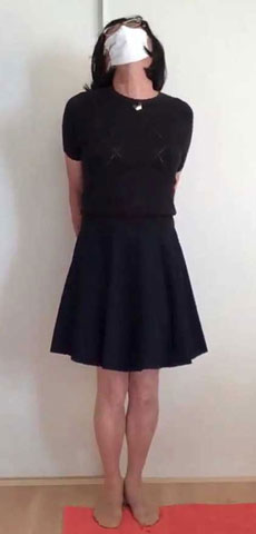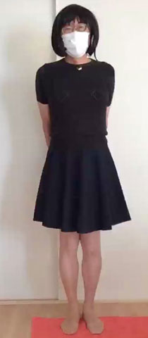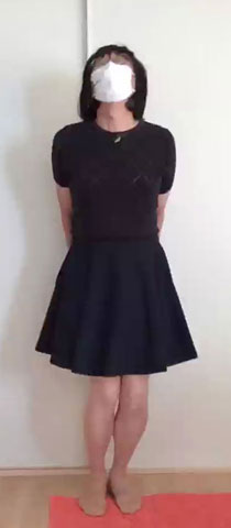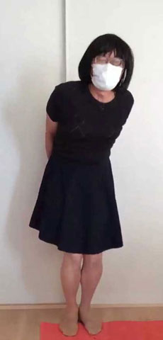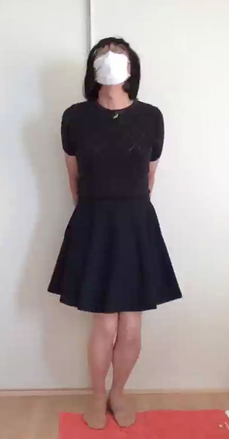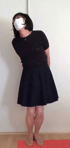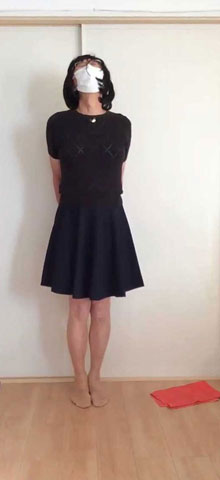 両手首には背中で冷たい手錠がかけられています。座ることも許されず、スカートの奥では性器亀頭部に嵌められた淫具が純子をいじめています。耐えるのよ、純子!