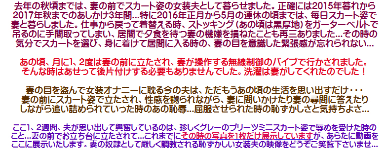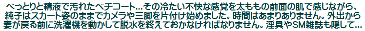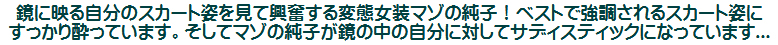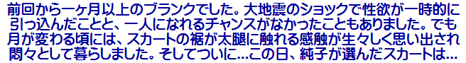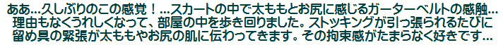 上半身ではブラジャーの拘束感、下半身ではガーターベルトの拘束感...純子は、久しぶりのスカート姿でのマゾヒスティックな拘束感に酔っています。