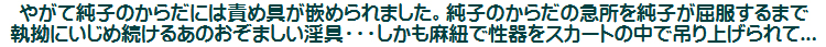 もちろん性器には既に責め具が嵌められています。急所にしっかりと...一見、清楚に見えるスカートの中では、恥ずかしい仕打ちに純子のからだ、悶えています...